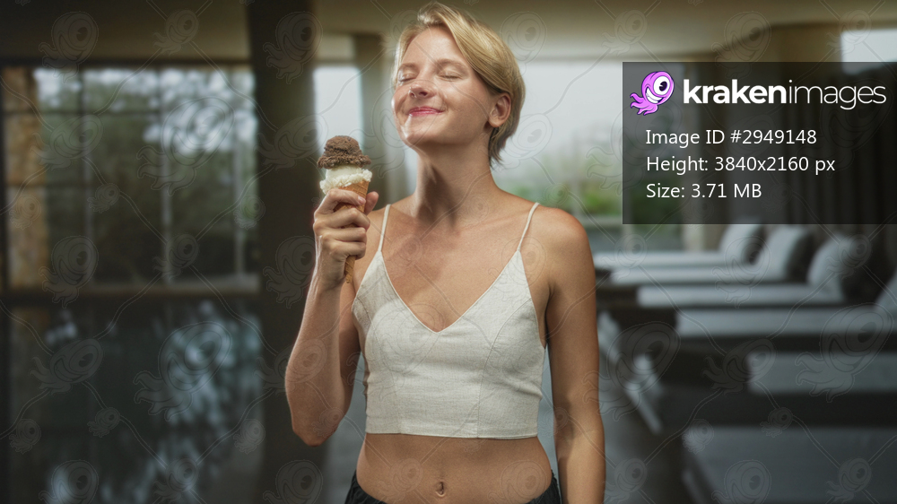 Woman holding a double scoop chocolate and vanilla ice cream cone in building, smiling with eyes closed and relaxed posture; summer joy.