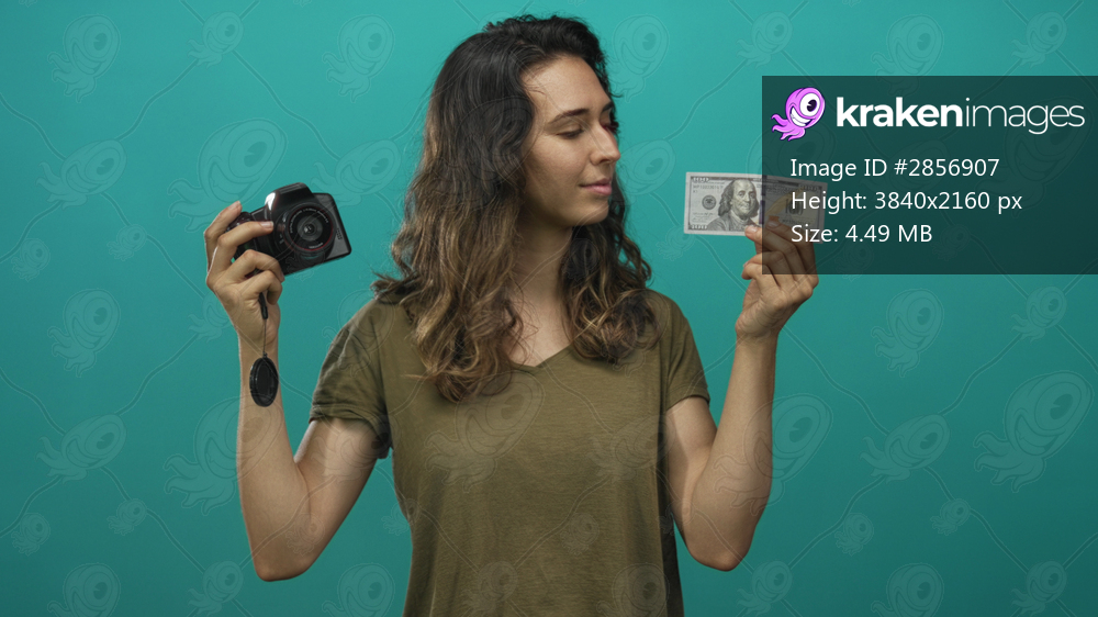 Woman holding a dslr camera in one hand and a hundred dollar bill in the other in studio; investment optimism.
