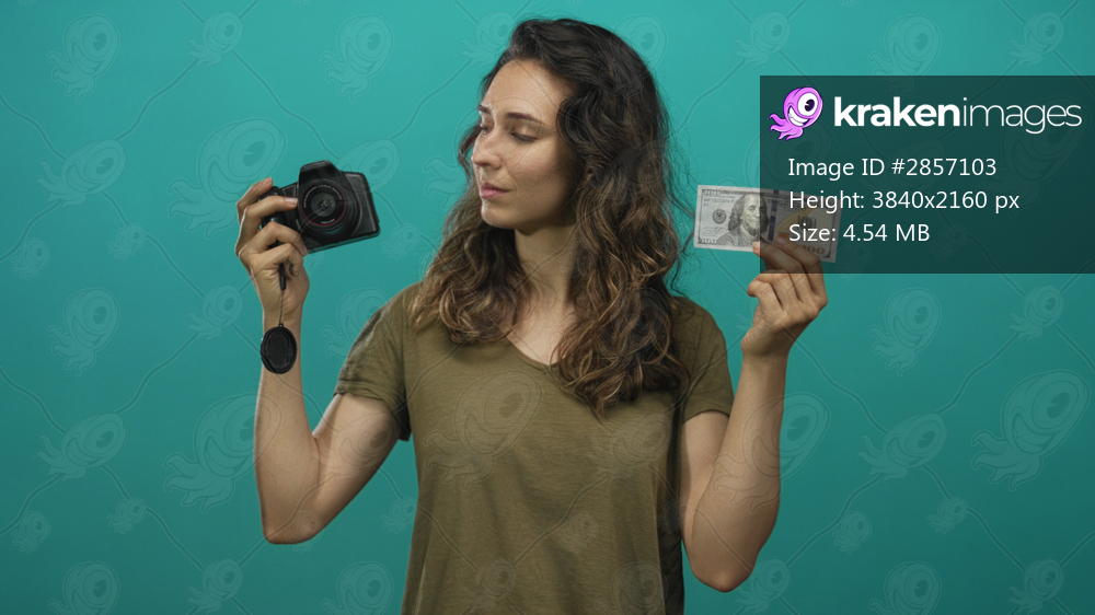 Woman holding a dslr camera in one hand and a hundred dollar bill in the other in studio; investment optimism.