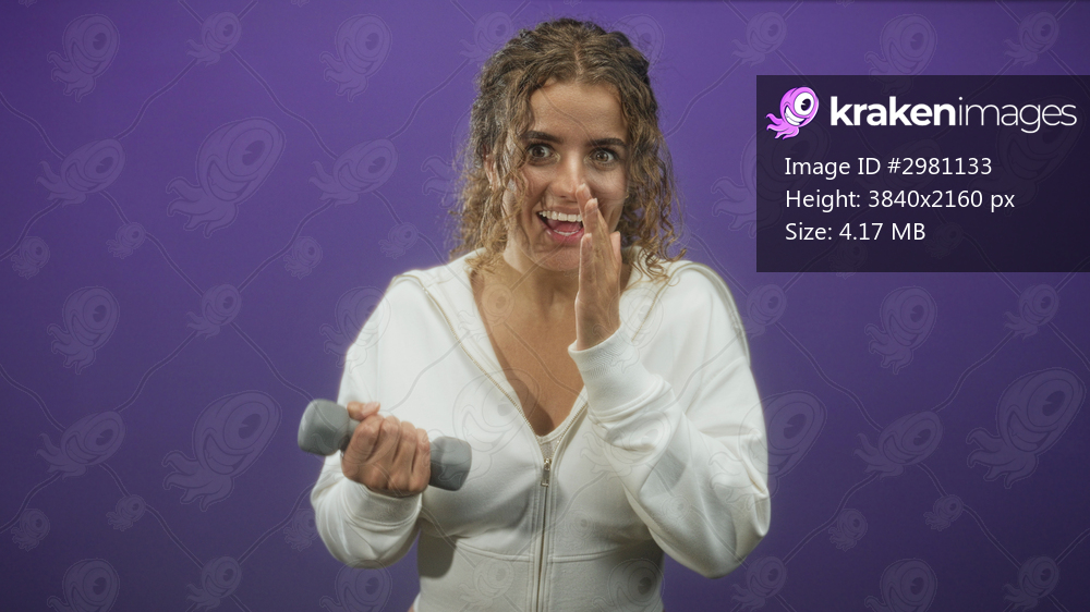 Woman holding a dumbbell, lifting with hand to cheek gesture in a purple studio wearing white zip hoodie; playful focus.