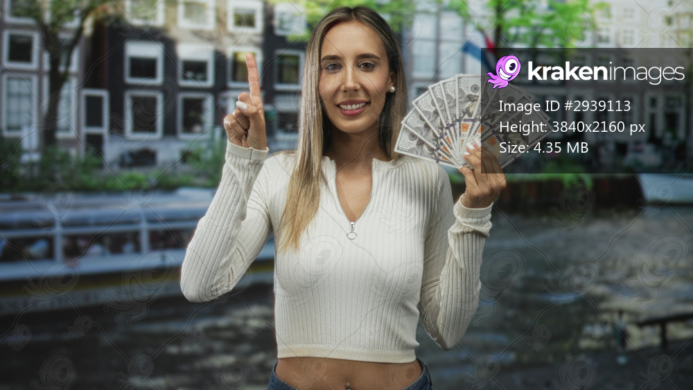 Woman holding a fan of banknotes and points finger up on an amsterdam canal street beside historic buildings; confidence success.