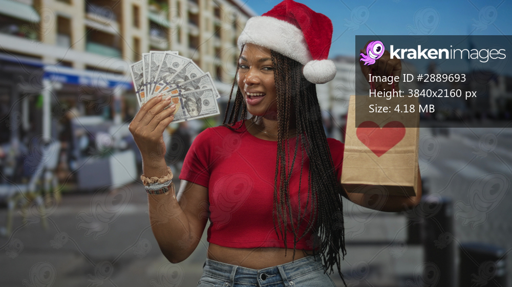 Woman holding a fan of cash and a heart gift bag on a busy street in daylight wearing a red santa hat and red crop top; holiday joy.