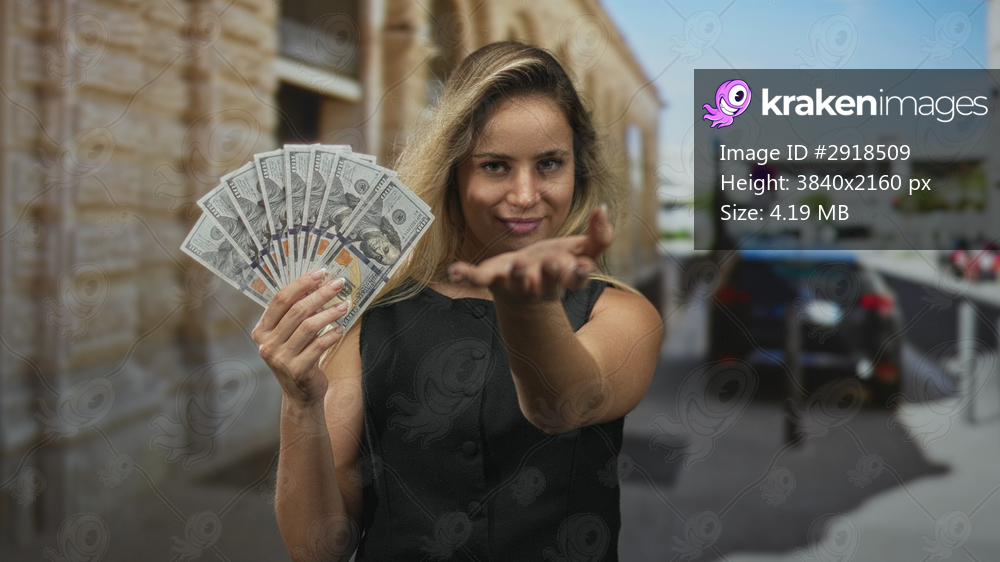 Woman holding a fan of cash with an outstretched palm toward viewer on a city street; confidence wealth temptation.