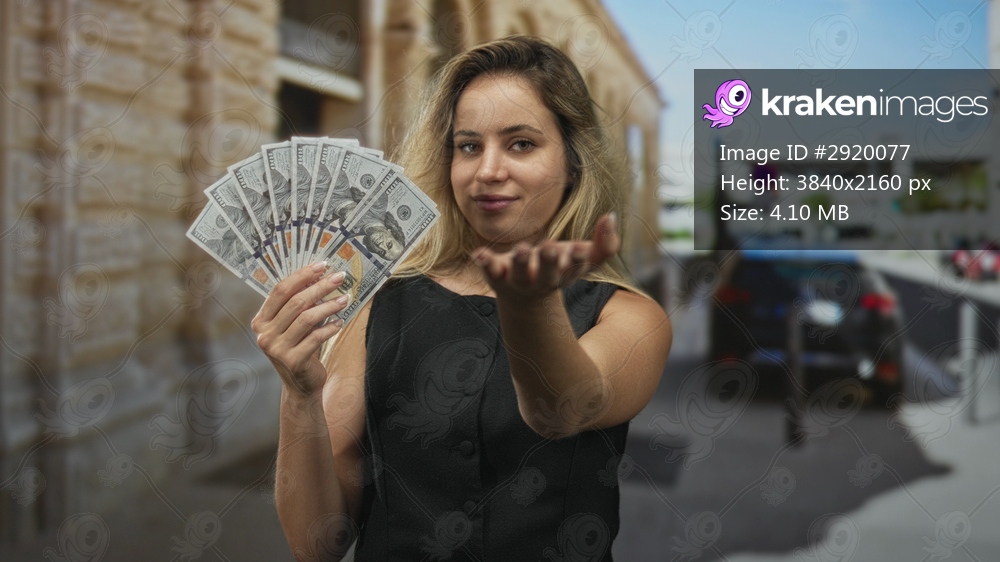 Woman holding a fan of cash with an outstretched palm toward viewer on a city street; confidence wealth temptation.