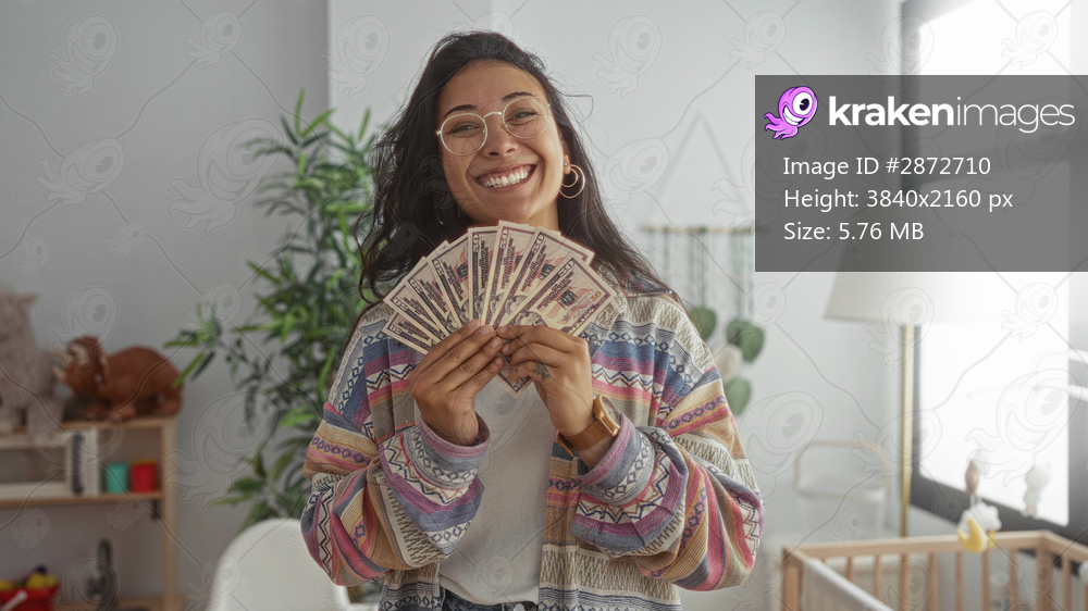 Woman holding a fan of cash with hands visible in a baby room inside a residential building; financial joy.