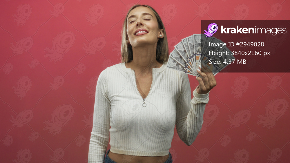 Woman holding a fan of dollar banknotes with hand raised in pink studio, eyes closed in relaxed pose; contentment success.