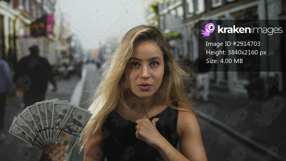 Woman holding a fan of dollar bills and pointing to her chest amid a busy city street; confidence success.