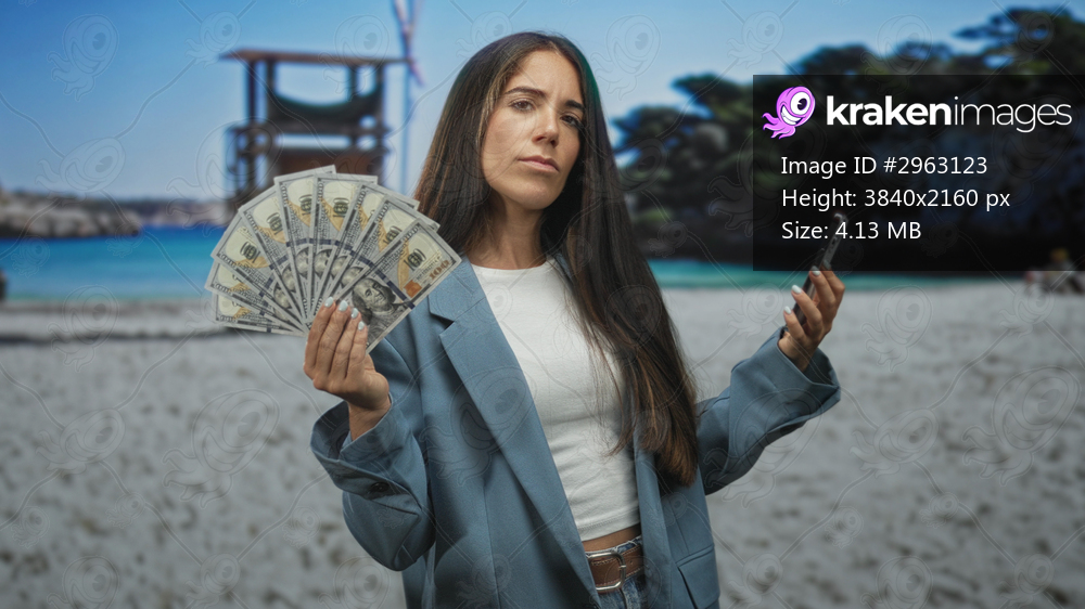 Woman holding a fan of dollars and a smartphone, holding bills in hand while standing before a studio beach set; confidence wealth success.