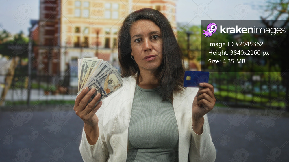 Woman holding a fan of dollars in one hand and a creditcard in the other, hands visible, standing on a street outside a city building; financial decision confidence. - Kraken Images