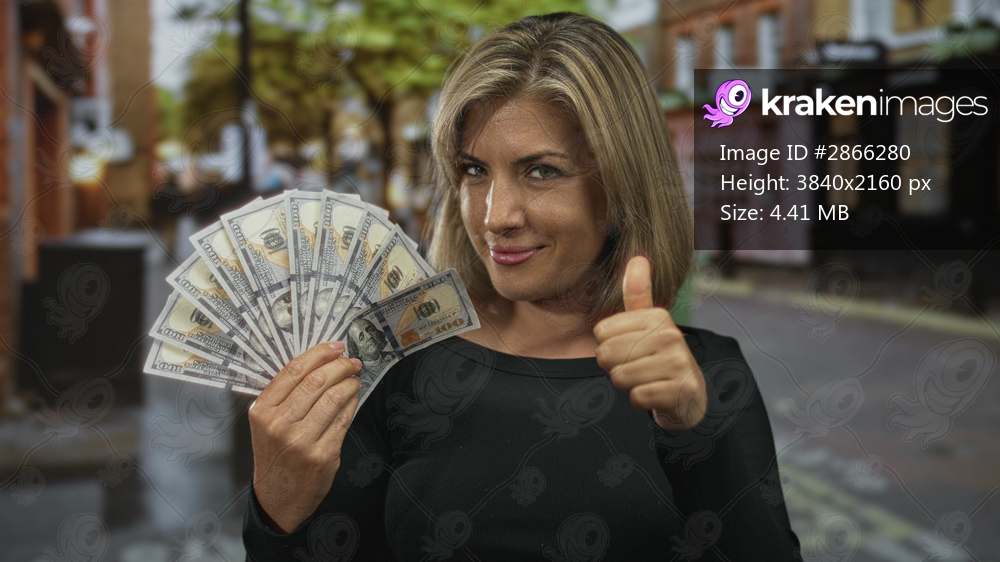 Woman holding a fan of hundred dollar bills and giving a thumbs up on a street; confidence success wealth.