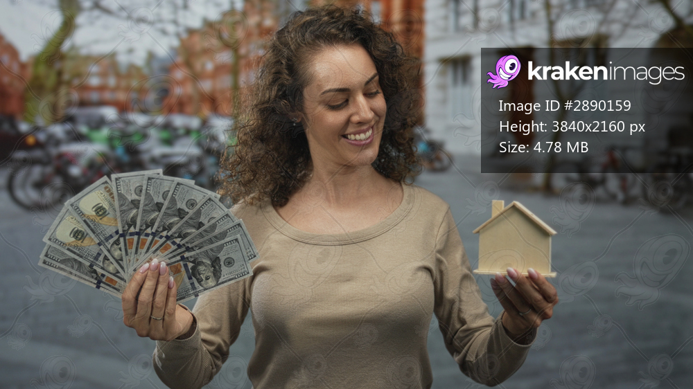 Woman holding a fan of us dollar bills in one hand and a small wooden house model in the other on a city street, smiling while comparing money and home; financial confidence. - Kraken Images