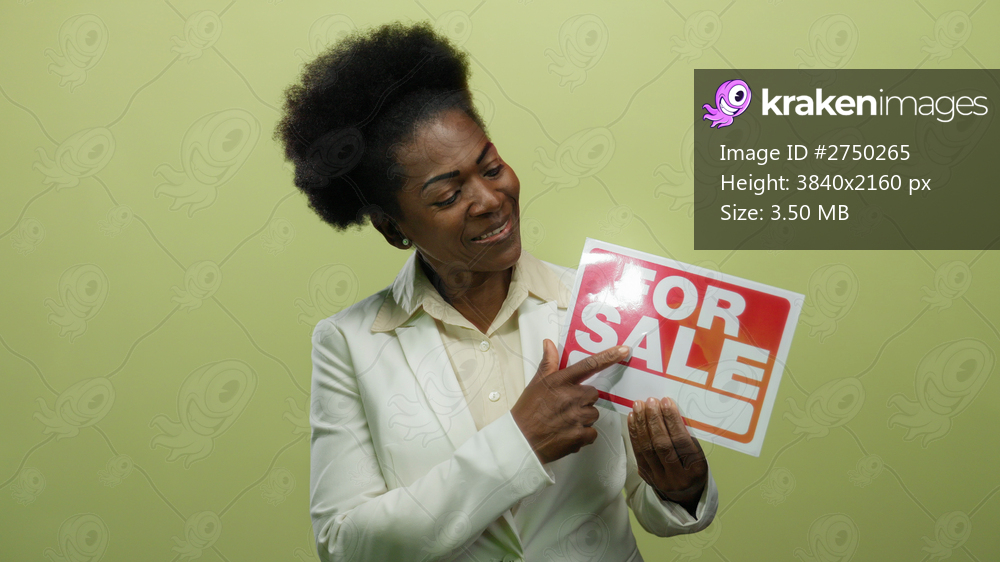 Woman holding a for sale sign in front of an isolated yellow background, smiling, suggesting a professional setting and engaging demeanor.