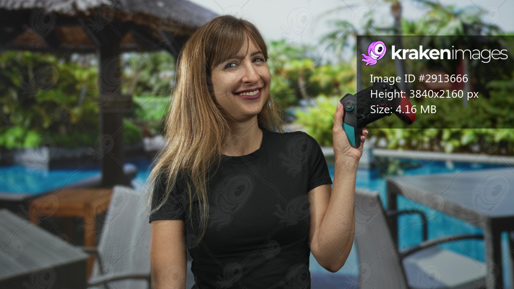 Woman holding a game controller at hotel pool, hand raised to show controller while smiling; playful vacation.