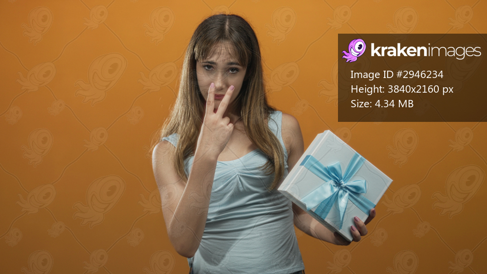 Woman holding a gift box with blue ribbon and making a two finger peace sign in studio with orange backdrop; playful attitude.