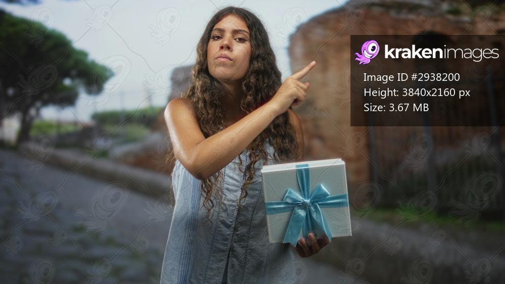 Woman holding a gift box with blue ribbon on a cobblestone street, hand raised in a pointing gesture; pensive solitude.