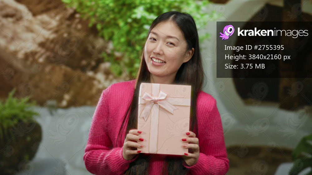 Woman holding a gift box smiles warmly against a lush outdoor backdrop, showcasing joy and celebration in an urban setting.