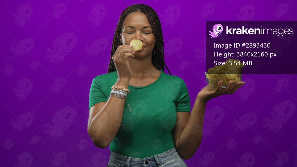 Woman holding a glass bowl of potato chips, hand reaching to grab a chip in studio with purple backdrop and green shirt; snacking pleasure everyday.