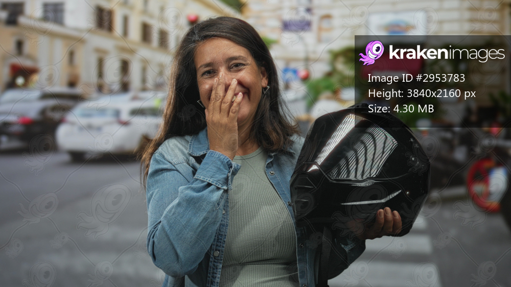 Woman holding a glossy black motorbike helmet while covering mouth with her hand, smiling and laughing on a bustling city street crosswalk amid cars and cafes; carefree joy. - Kraken Images