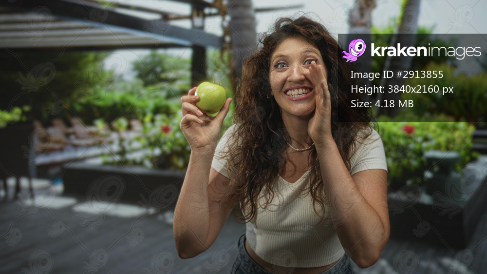Woman holding a green apple at hotel pool smiling with raised hand and casual jeans crop top; healthy snack joy.