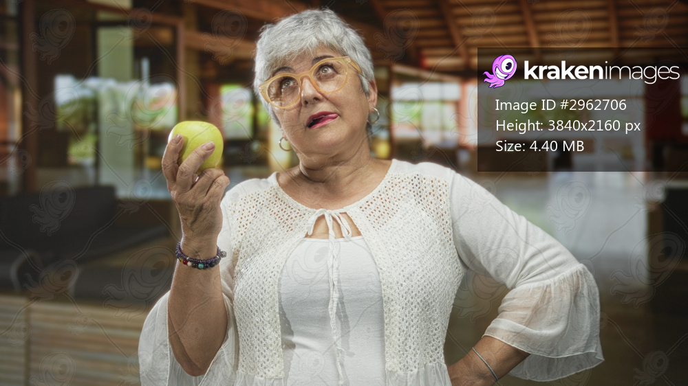 Woman holding a green apple in her hand inside a building lobby, wearing glasses and a white top, looking up with thoughtful pout; contemplation.