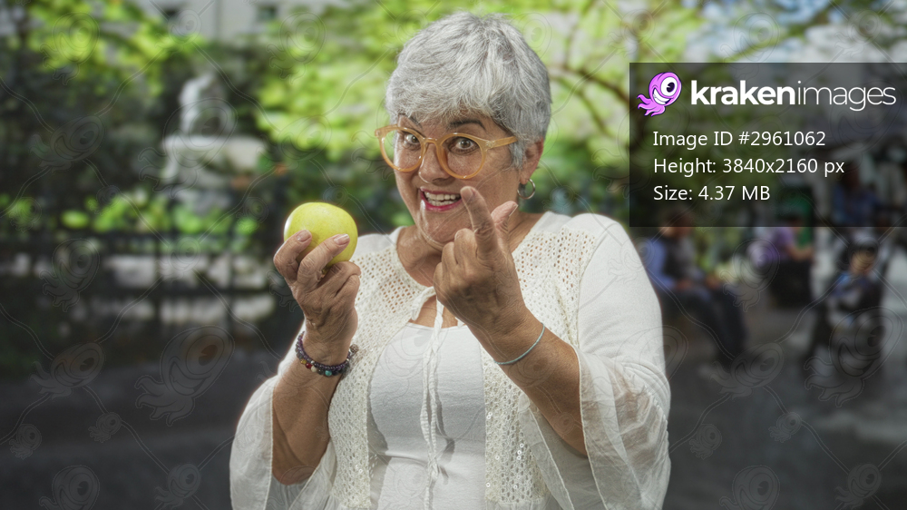 Woman holding a green apple points finger to it in a park fountain area while smiling and wearing a white blouse; playful wellness.