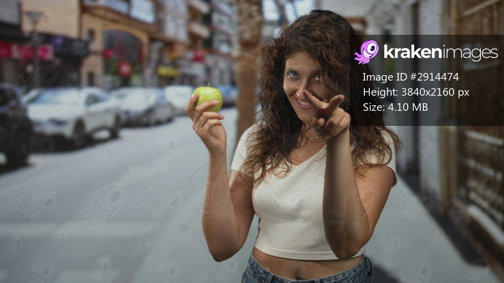 Woman holding a green apple and showing two fingers on a street in the city; playful healthy snack moment.