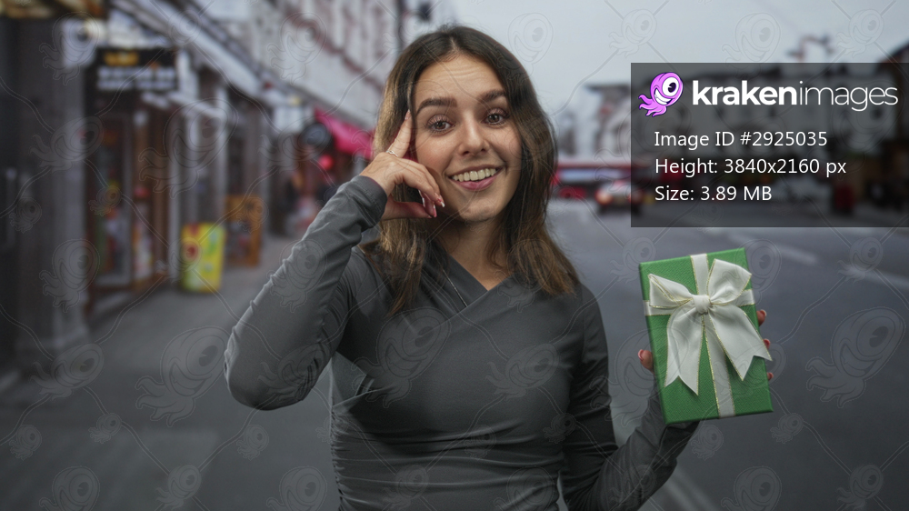 Woman holding a green gift box with white bow and finger to temple on a street; thoughtful joy reflection.