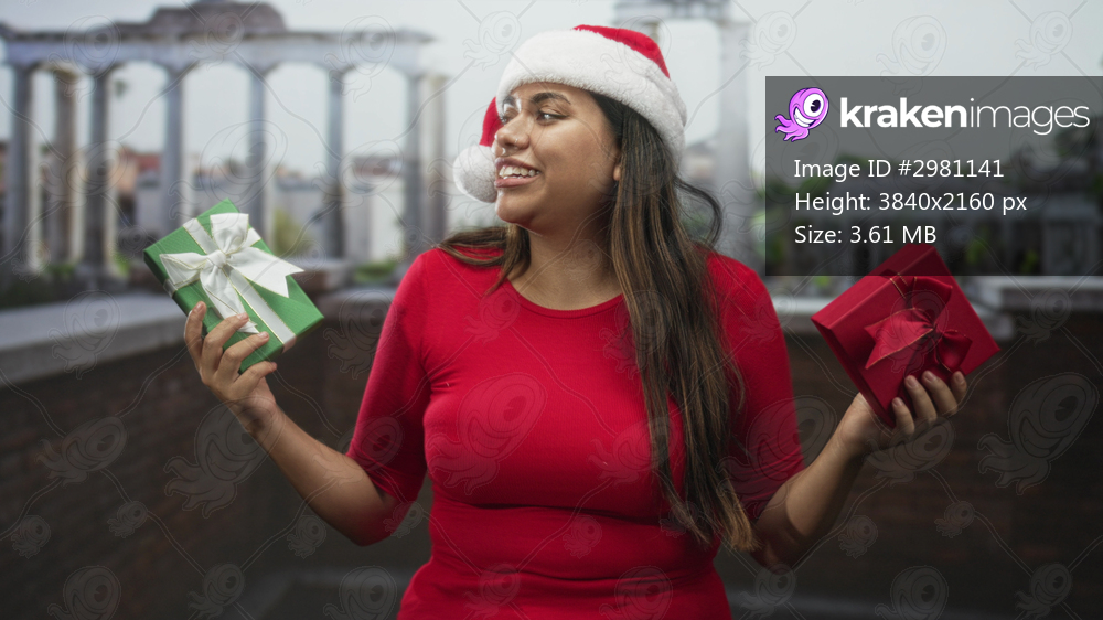Woman holding a green gift in her left hand and a red gift in her right hand wearing a santa hat while comparing presents on a building terrace; holiday decision cheerful. - Kraken Images