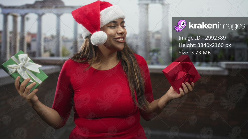 Woman holding a green gift in her left hand and a red gift in her right hand wearing a santa hat while comparing presents on a building terrace; holiday decision cheerful. - Kraken Images