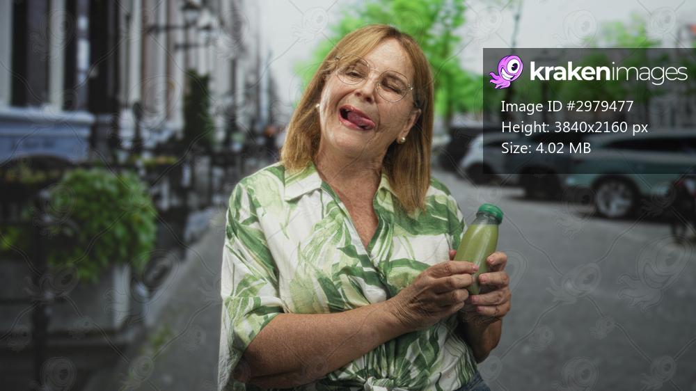 Woman holding a green juice bottle, sticks tongue out while smiling and presenting the drink on a street; playful joy.