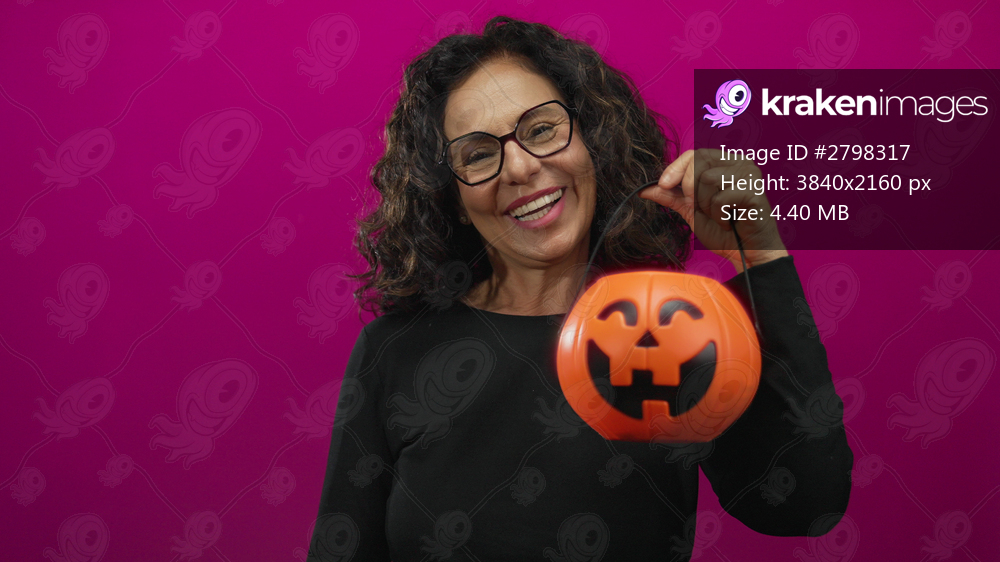 Woman holding a halloween pumpkin basket smiles on an isolated pink background, exuding festive joy and warmth.