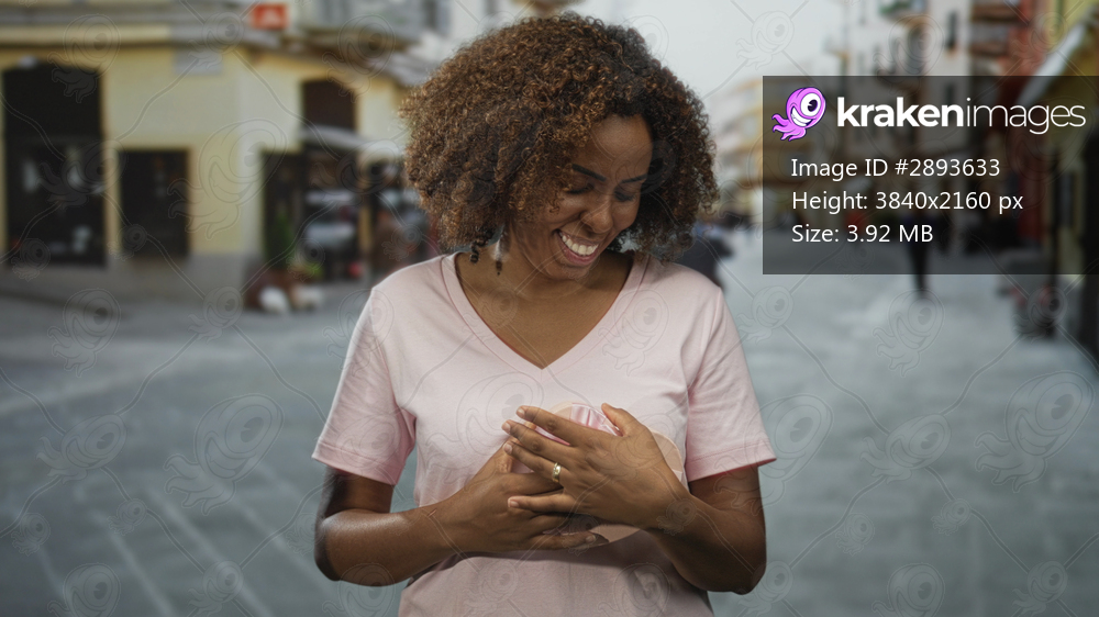 Woman holding a heart shaped box to chest with clasped hands and laughing on a cobblestone street; joy.