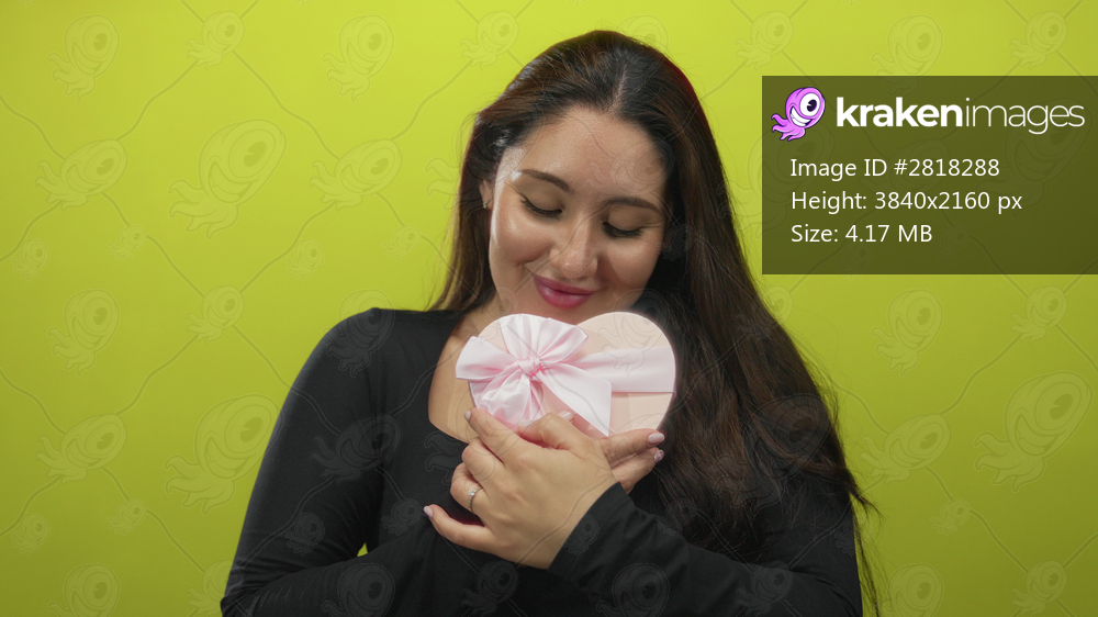 Woman holding a heart shaped gift box with bare hands hugging it against a lime green studio wall; affection gratitude.