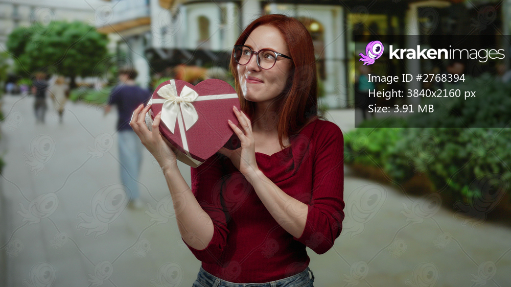 Woman holding a heart-shaped gift box on a city street wearing glasses and red shirt smiling surrounded by urban greenery and people walking in the background - Kraken Images