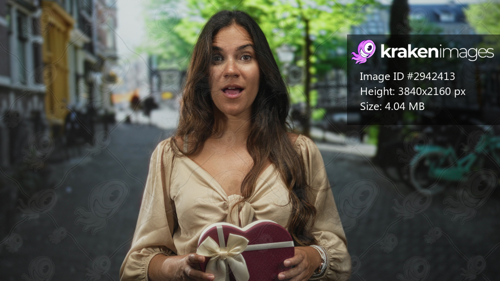 Woman holding a heart shaped gift box on a cobbled street in city, eyes closed with pensive expression and long hair framing chest; longing solitude.