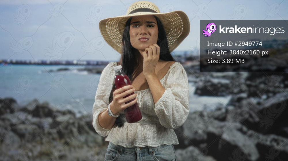 Woman holding a juice bottle and touching her chin while grimacing with a sun hat in studio; uncertainty.