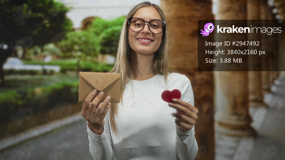 Woman holding a kraft envelope and small red heart while extending her hands in a building colonnade; affection connection giving.