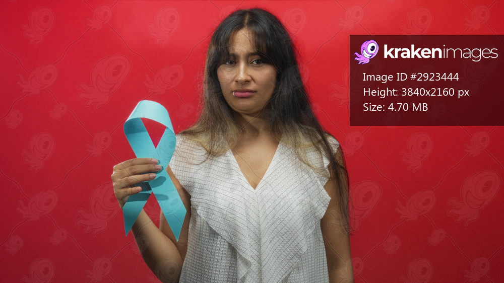 Woman holding a large blue awareness ribbon in a red studio setting with visible hand gesture and slight smile; health awareness concern.