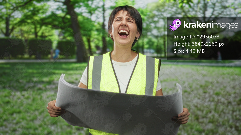 Woman holding a large blueprint with hands visible while wearing a yellow reflective safety vest in a forest setting with trees and grass; planning amusement. - Kraken Images