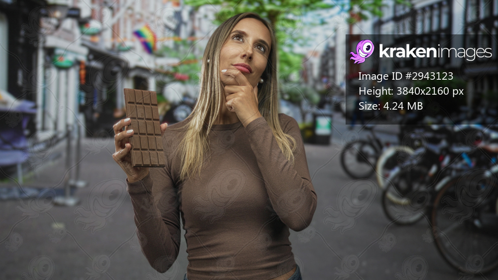 Woman holding a large chocolate bar on street with hand on chin pensive pose while looking at the bar; thoughtful curiosity.
