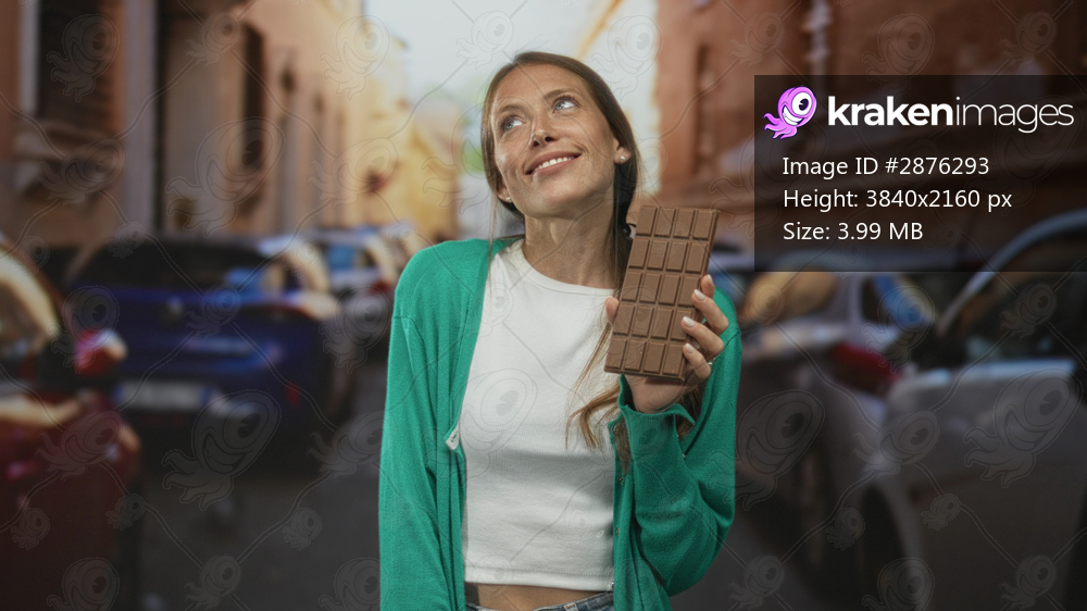 Woman holding a large chocolate bar with one hand on a narrow city street between parked cars, smiling and looking upward; joy indulgence.