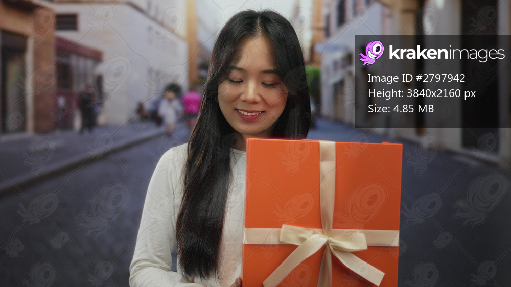 Woman holding a large gift on a vibrant street, showcasing a cheerful expression and surrounded by an urban outdoor scene, reflecting a joyful moment.