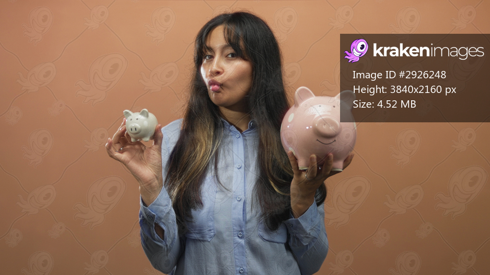Woman holding a large pink piggy bank and a small white piggy bank, puckering lips in a peach studio; savings comparison playful.