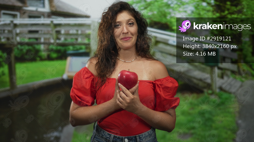 Woman holding a large red apple with both hands against her chest on a street beside a wooden bridge and grassy canal; curiosity.