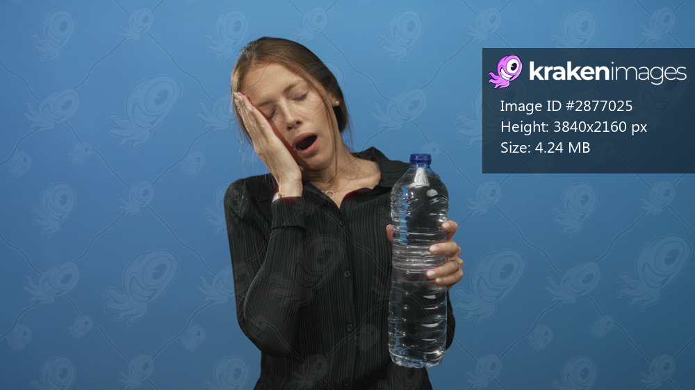 Woman holding a large water bottle with hand on cheek yawning in blue studio; tiredness dehydration thirst.