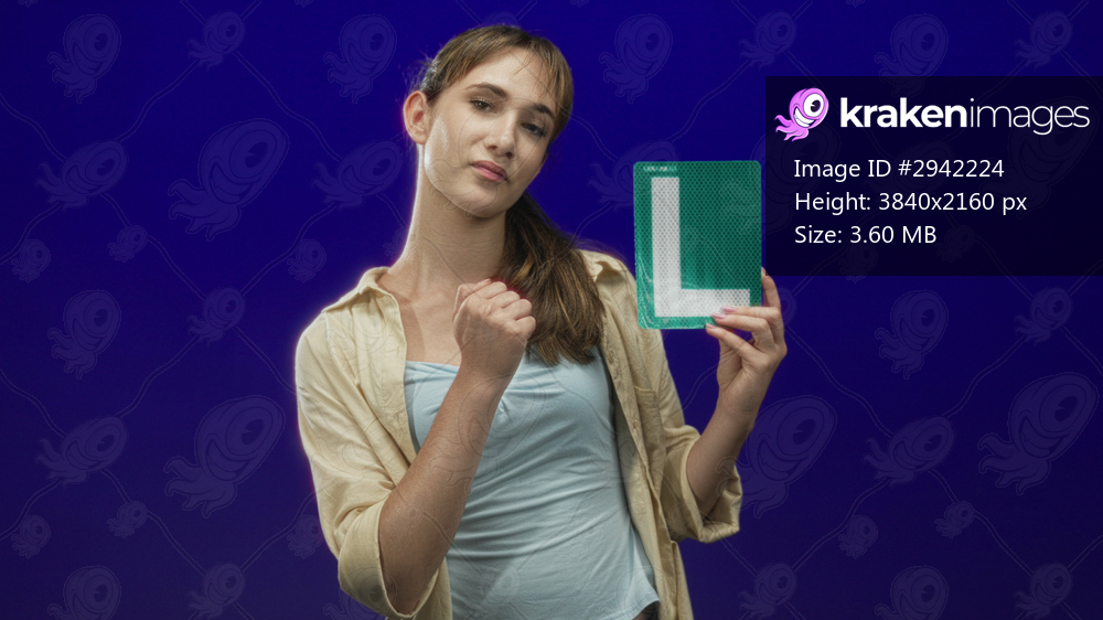 Woman holding a learner plate with a fist pump gesture in studio with a purple backdrop; new license confidence.