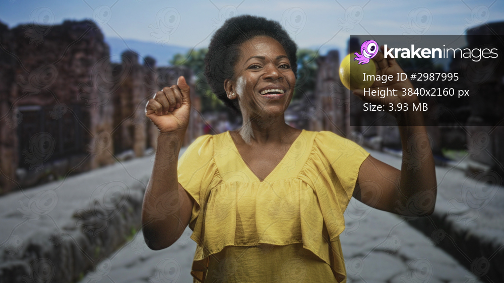 Woman holding a lemon in raised right hand on a stone street amid ancient ruins, smiling and pointing with left finger; joy vitality.