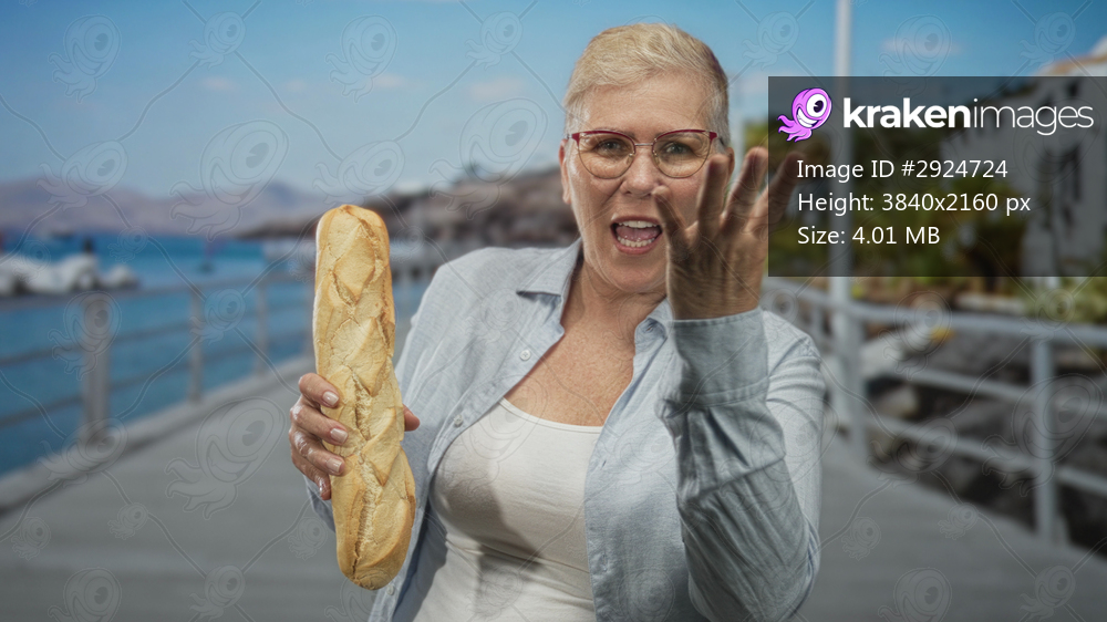 Woman holding a long baguette and gesturing with an open hand on a seaside promenade by the railing under blue sky; cheerful sharing moment.
