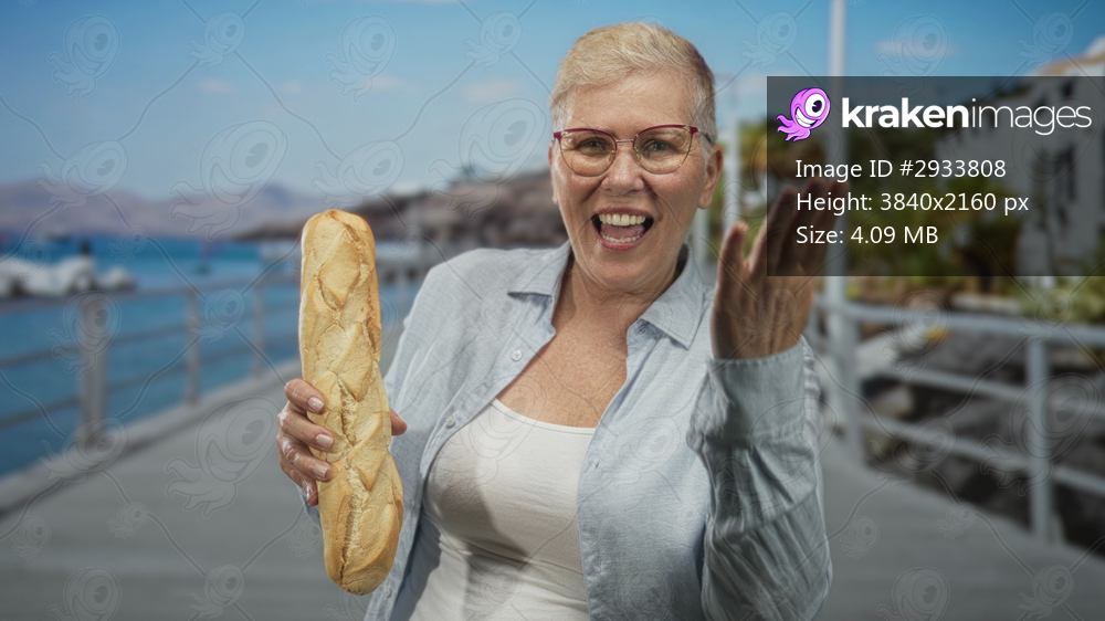 Woman holding a long baguette and gesturing with an open hand on a seaside promenade by the railing under blue sky; cheerful sharing moment.