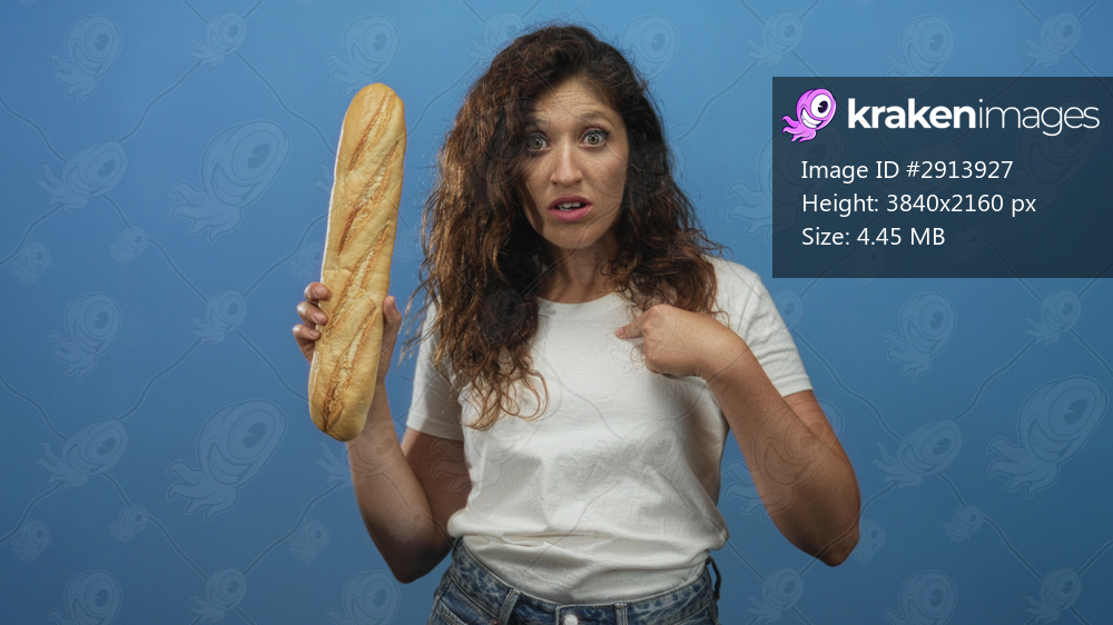 Woman holding a long baguette and pointing to her chest in a blue studio; confusion uncertainty.